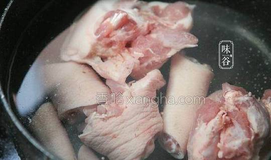 4.猪尾巴凉水下锅烧开1分钟,猪尾巴后去掉浮沫血水洗干净备用。