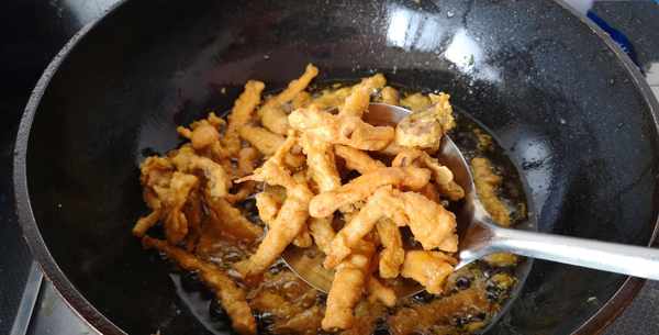 然后将它们放入70%的热油锅中,调中小火,直到所有的蘑菇都在锅里,然后调中火。大火期间,不断翻动均匀受热,直到香菇全部炸成金黄色。意思是已经熟了,出锅了。