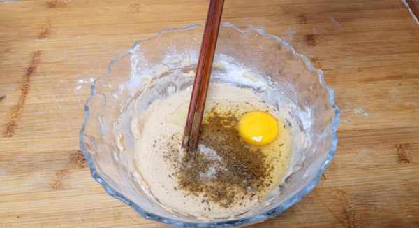 然后将一包香脆肉丝炸粉倒入碗中,加少许水调匀。如果没有脆皮炸粉,可以用面粉和淀粉来调,但是需要加一点食用油,面粉和淀粉的比例是28,适合没有干面的状态,加少许胡椒粉、十三香、孜然粉、食用盐少许,然后打入一个鸡蛋,继续朝一个方向搅拌,最后呈无干粉的细腻光滑状态。