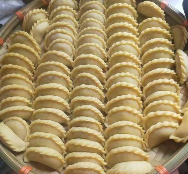 除了食材的不同,饺子和饺子的形状也不同。饺子只需要对折,但饺子必须有复杂的图案,当地人称之为“向日葵”。最后是馅料,可以加糖、榛子和芝麻,也可以加肉馅。赵妈妈正在做肉馅。将新鲜的半肥猪肉剁成肉末,加入荞麦,也就是小葱。萝卜干和萝卜干,烤干沥干水分后,加少许蚝油和糖调味,然后擀成又白又肥的角。