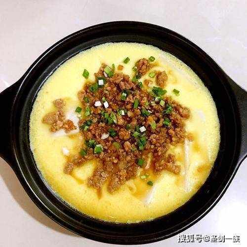 6:炒好的肉末倒在蒸5分钟的豆腐上,这时候蛋羹已经定型了,盖上盖子接着再蒸2分钟就可以了。出锅以后,撒上适量小葱点缀,再倒少许生抽进去调味就可以了。