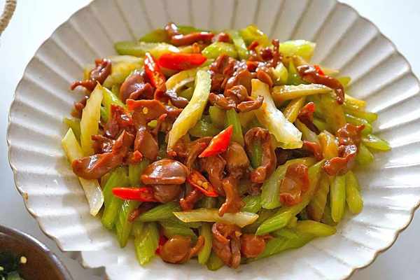 4、热锅热油,下入辣椒、芹菜翻炒2分钟,再加入鸡胗、盐、鸡精继续炒2分钟左右,即可盛出食用。