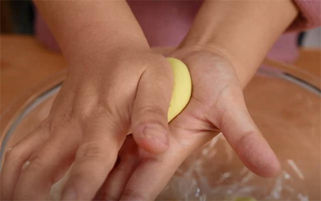 2.时间到了之后我们直接取一小块面团,在掌心反复的抓到圆润的状态之后,再搓成小圆球,用手掌按扁。