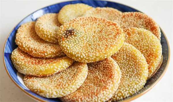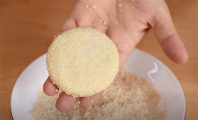 4.按成饼子之后先在清水里滚一圈,然后再沾上一层白芝麻,这样芝麻会粘的更牢固,稍微的压一压形状,我们这个坯子就做好了。