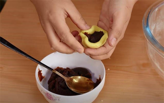 3.放上一点豆沙馅,把这个封口处捏死。