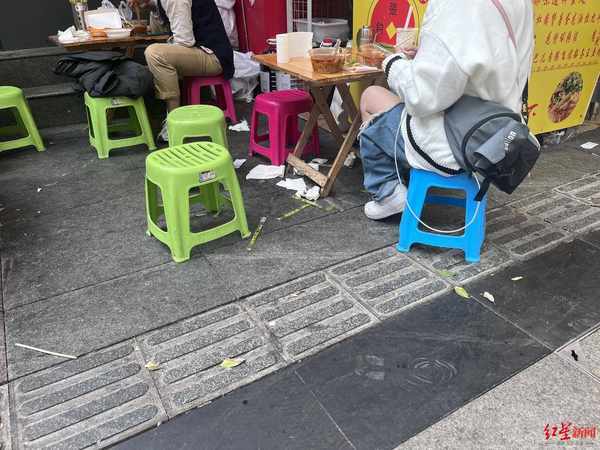 在个别生意好、人手短缺的小吃店门口,餐桌底下到处是游客散落的纸巾和食物残渣。记者注意到,几波客人走后,商家才腾出时间清理。