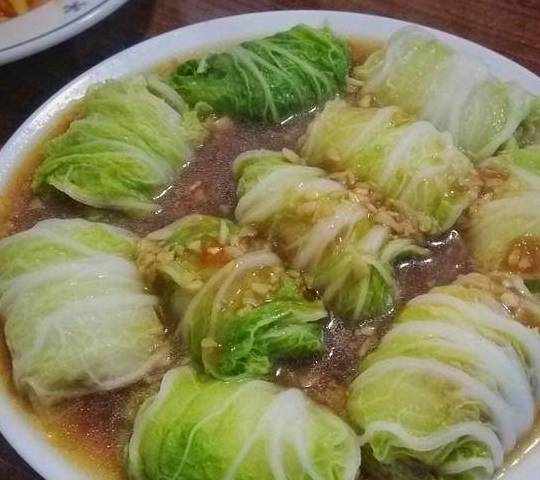 ②锅内加水,待水烧开后,下白菜帮汆烫,捞起,拍上干淀粉;牛肉泥、韭菜粒、姜末、火腿粒,调入部分盐、鸡精、开二淀粉搅成馅,酿在大白菜帮上,蒸约8分钟,取出摆盘。