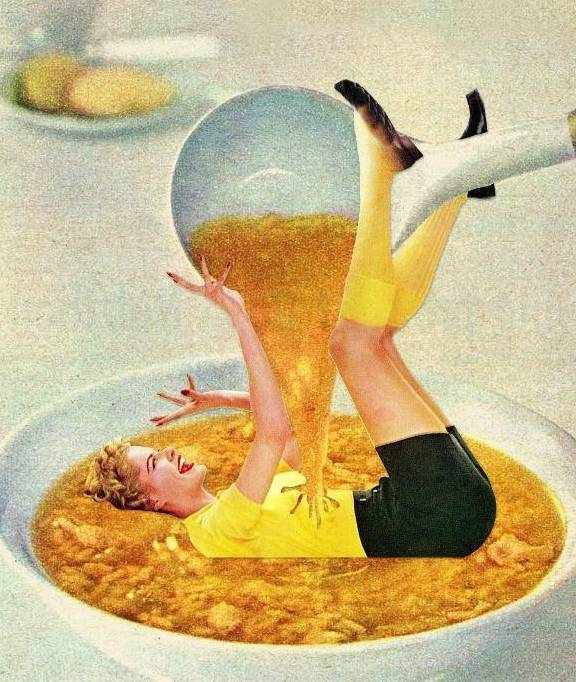 第一张,就很博人眼球,一个金发女郎,上身穿着红色的上衣,下身穿着黄色短裙,两条修长的大腿伸进米饭粒,一头秀美的金发,似瀑布般散进肉汁里,古语说,秀色可餐,也就是这个意思了。