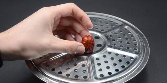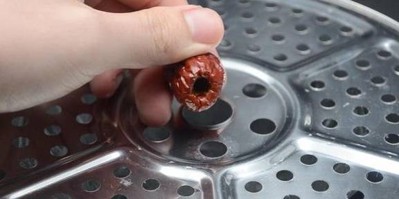红枣清洗完之后,我们再来给红枣去核。先准备一个碗,将厨房里的蒸格扣在碗上就可以了。再将清洗好的红枣竖着立在蒸格小孔上面并且用筷子戳进红枣里面排出红枣核。我们可以看到红枣核很轻松就能排出蒸格了。