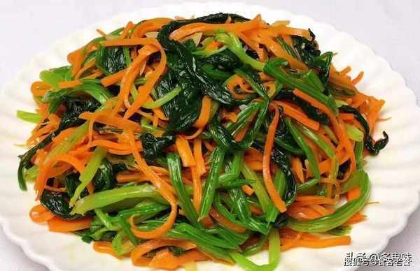3、锅中放入油,油热放入蒜碎爆香放入胡萝卜丝翻炒变色,加一勺蚝油,盐适量,放入菠菜翻炒均匀即可出锅。