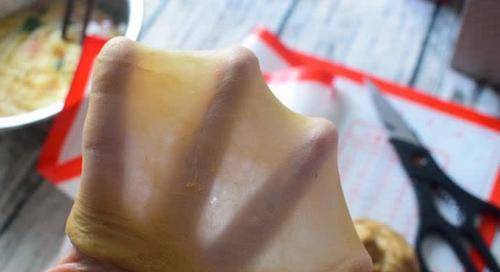 用擀面杖擀成长舌头状,然后对折卷起。