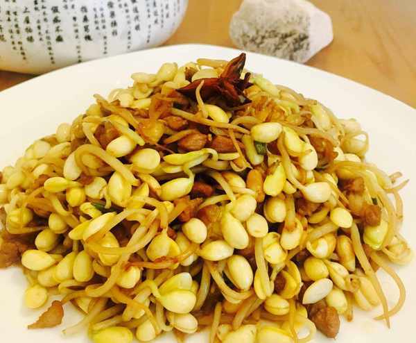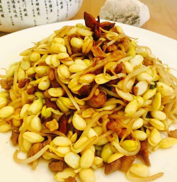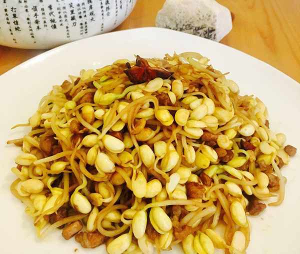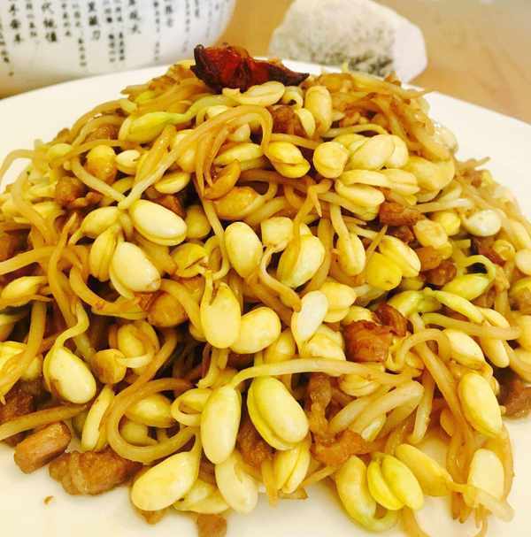 肉丁炒黄豆芽是一道营养丰富的家常菜肴,主要材料为黄豆芽、猪肉等等。做法简单,美味可口。材料:黄豆芽,猪肉,葱,蒜,八角,花生油,料酒,生抽,盐等等
