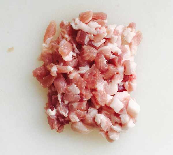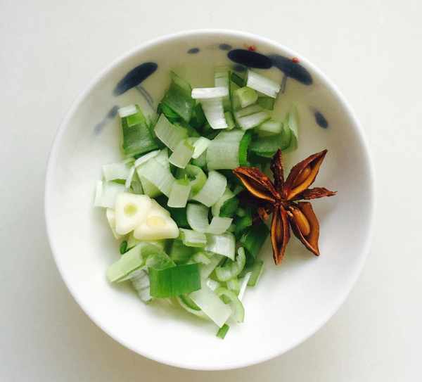葱、蒜剥去外皮清洗干净,分别切成葱花、蒜片,八角一颗冲洗干净,肥瘦相间的猪五花肉用温水冲洗干净先切成片,再切长条,最后切成小肉丁备用