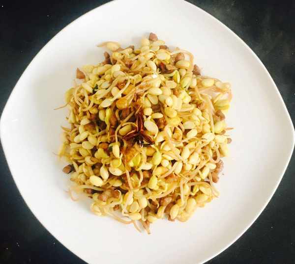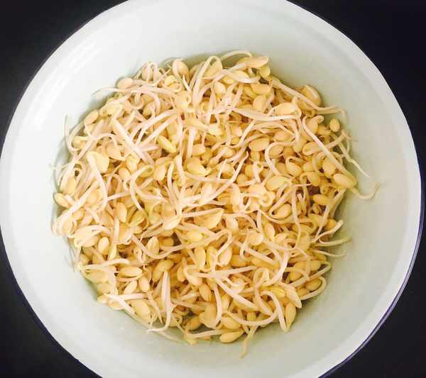 黄豆浸泡使之长出嫩芽,捡去没有脱落的黄豆皮,用水反复冲洗干净控干水分备用