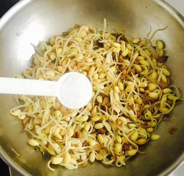 炒至黄豆芽断生加入适量的盐调味儿并且翻炒均匀,如果锅中有汤汁可以改旺火收干汤汁再关火
