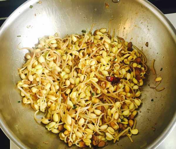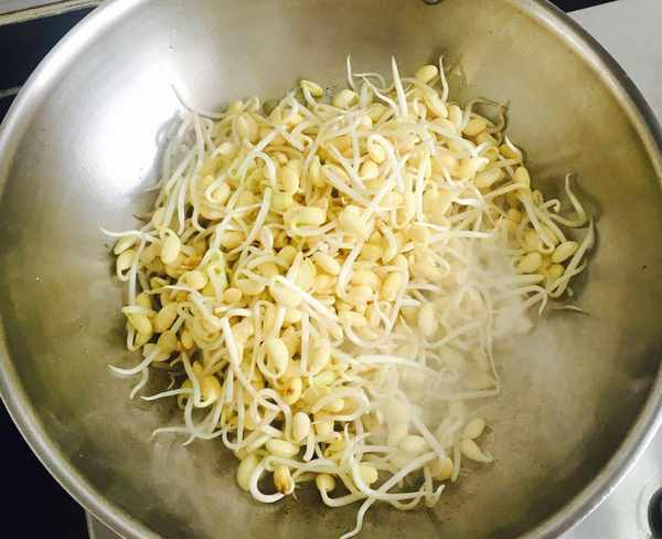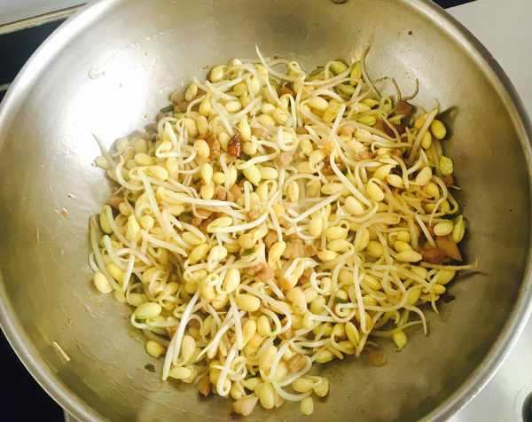 倒入黄豆芽中火翻炒均匀,因为黄豆芽不太容易炒熟,所以要中火多炒一会儿