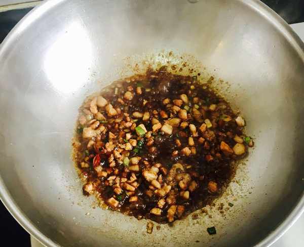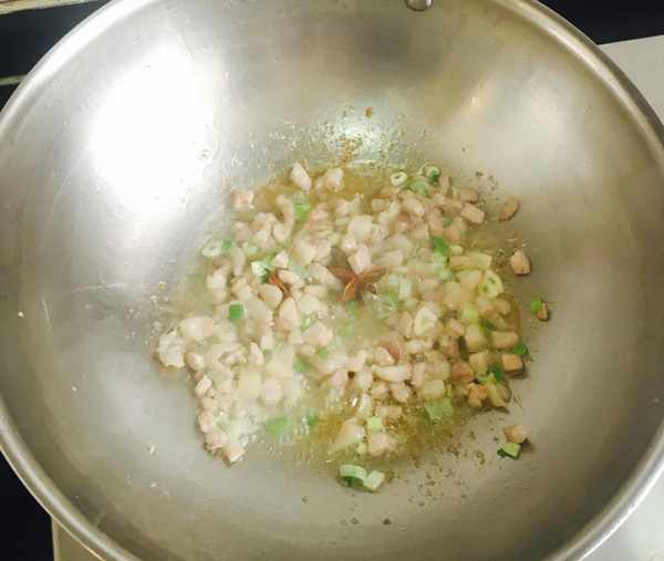 热锅加入适量的花生油放入肉丁炒出香味儿并且出油,肉丁炒香后放入葱花、蒜片、八角爆香,烹入适量的料酒和生抽翻炒均匀