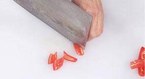 3 洗好的红椒切开,去籽,切成小块,备用。
