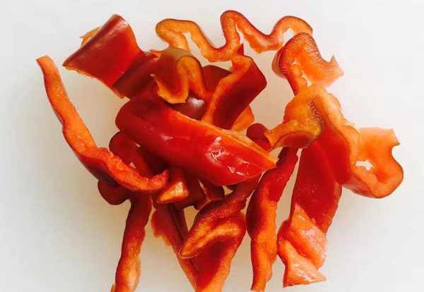 苦瓜两根清洗干净,从中间切开去除瓜瓤和种子,切成厚片,红椒切粗丝备用