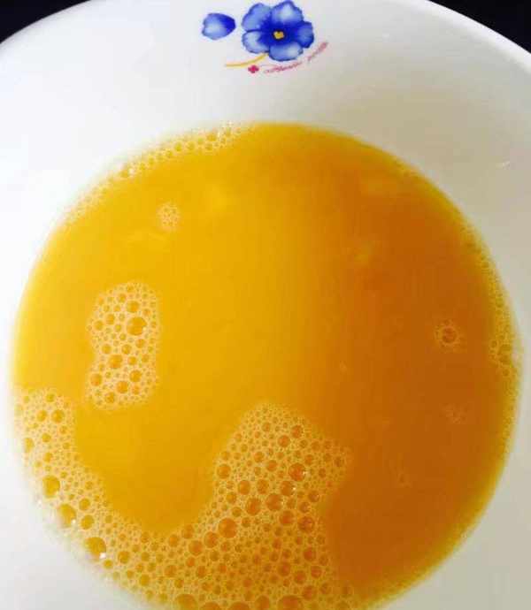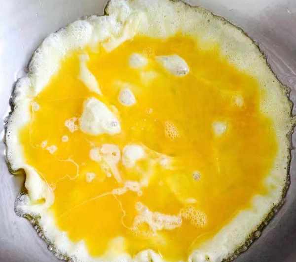 鸡蛋两个加适量的盐少许料酒和清水打散,热锅加油倒入蛋液炒香盛出备用
