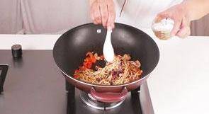 13 加入适量生抽、老抽、盐、鸡粉,翻炒入味。