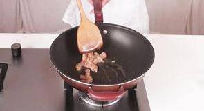 10 锅底留油烧热,倒入肉片,翻炒至转色。