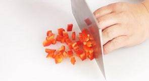 3 洗净的彩椒切开去籽,再切条,切粒。