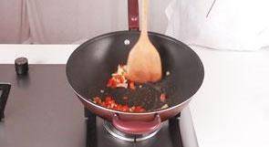 11 加入虾米、彩椒、芹菜,炒香。