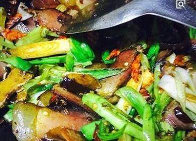5.然后倒入青蒜、红辣椒段,继续翻炒均匀充分入味变软,出锅前撒少许盐调味即可!