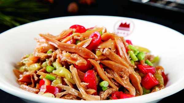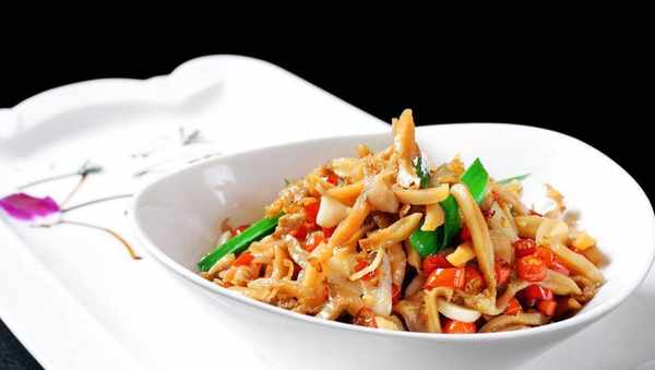 2、锅入色拉油烧至五成热,下入河蚌肉炒香,淋入龙牌酱油炒匀盛出。