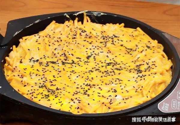 起锅开小火,均匀刷上植物油,油温五成热时,把馅料倒入锅中,摊成薄厚均匀的圆形面饼,盖上锅盖烙3分钟,烙制面糊全部定型,在上面打入一个鸡蛋,把蛋液刷均匀,再撒上一层黑芝麻,盖上锅盖再烙1分钟。