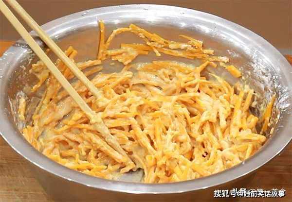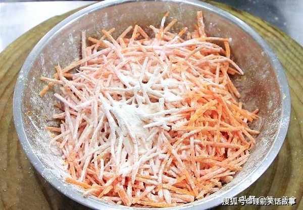 准备胡萝卜一根,削去外皮,先切成薄片再切成细丝放入盆中,淋入适量的植物油,搅拌均匀,防止胡萝卜在蒸的过程中大量出水,放入玉米面50克搅拌均匀,加入小麦面粉50克,用手抓匀备用。