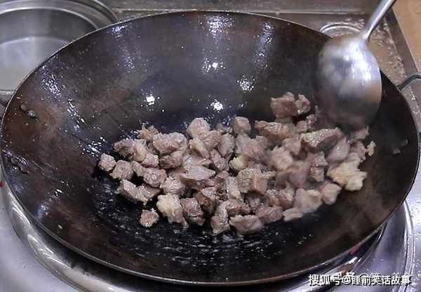 锅内烧油,油烧热以后,把牛肉倒入锅中进行煸炒,炒出里面的水分,牛肉炒香以后倒出来,控油备用。