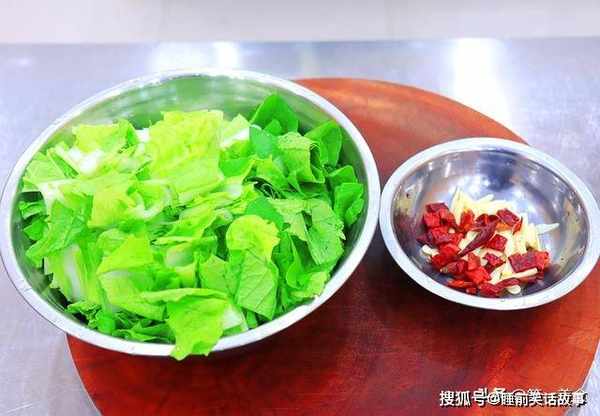 准备一把小白菜,切掉根部,把叶片打散以后放入清水中,加入一勺食盐,洗净上面的泥沙和杂质,捞出来沥干水分,切成段备用。