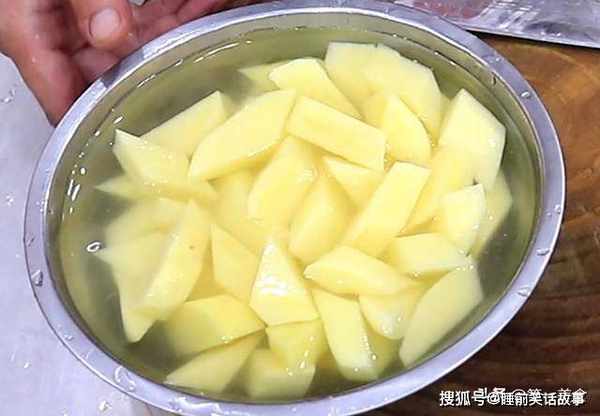 准备土豆两个,削去外皮,先切成厚片再切成菱形块,用清水泡上,隔离空气,以免氧化变黑。