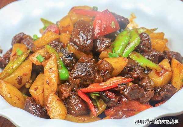 20分钟以后牛肉已经炖好了,把里面的香料挑出来,以免影响口感,把牛肉重新倒入炒锅中,放入土豆,开大火收汁,期间要经常翻动以免糊锅,放入青红椒,快速翻炒均匀,汤汁基本收干,均匀包裹在食材表面时即可出锅,再撒上一点葱花,一道酱香十足的酱牛肉烧土豆就做好了。
