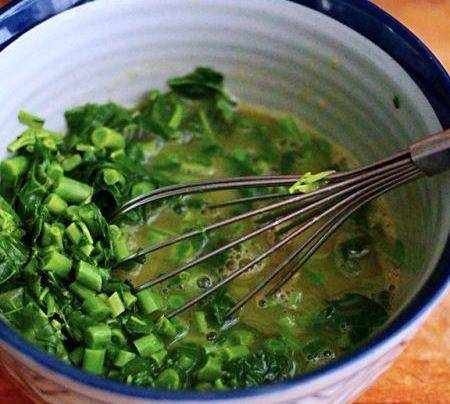 把切碎末后的香椿倒入搅拌均匀的鸭蛋液里,把香椿末和鸭蛋液搅拌均匀就可以了;