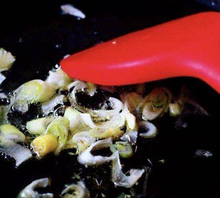陶瓷锅提前加热后,加入花生油后,烧至6成热时,加入提前用刀切好的葱花爆香后;