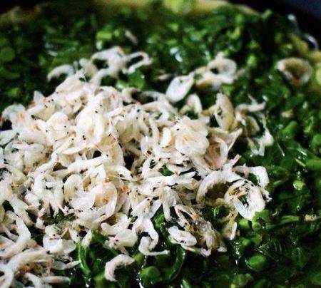把淡干虾皮再倒入锅中快速翻炒片刻(这个时候把虾皮放入锅中,是为了保持淡干虾皮的口感和营养成分,淡干虾皮放早了,我觉得味道会大打折扣,亲们可以回去试试)