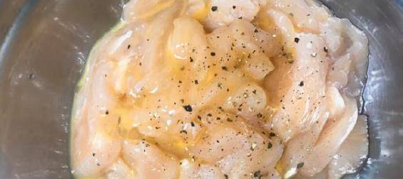 2、然后把切好的鸡胸肉洗净沥干,打一个鸡蛋进去,可以使鸡肉嫩滑,再倒两勺料酒、一勺生抽、适量胡椒、盐去腥提味,再倒一点油保持鸡肉的湿润,抓匀后腌制10分钟。