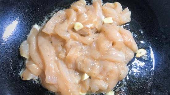 3、然后把姜蒜切好就可以开始炒了,热锅倒油,烧至七成热后下姜蒜,倒鸡肉,开中小火炒至变白。