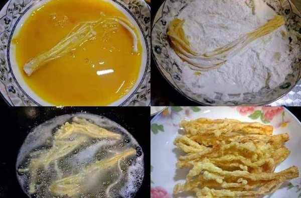 3、先把金针菇放在鸡蛋液中蘸一圈,再放入面粉或者淀粉中蘸上面粉。锅中热油,放入处理好的金针菇,放进去炸。炸的时候,用中小火炸至金黄色就可以了,炸完控油、装盘。这里不要用大火,否则很容易就炸焦了。
