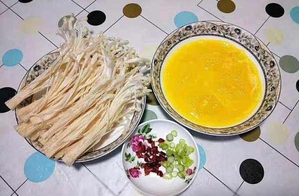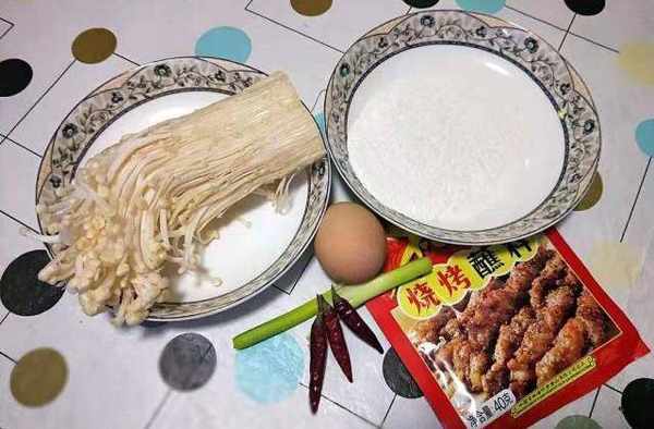 食材还有配料就是金针菇、面粉、鸡蛋、葱、红辣椒、还有孜然粉或者椒盐粉等,都是可以的,按照自己的口味来。做法也是超级简单,一起来看看吧!