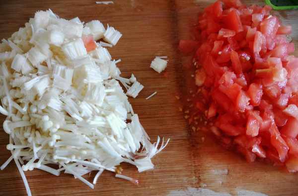1. 西红柿、金针菇洗净切成碎片备用。