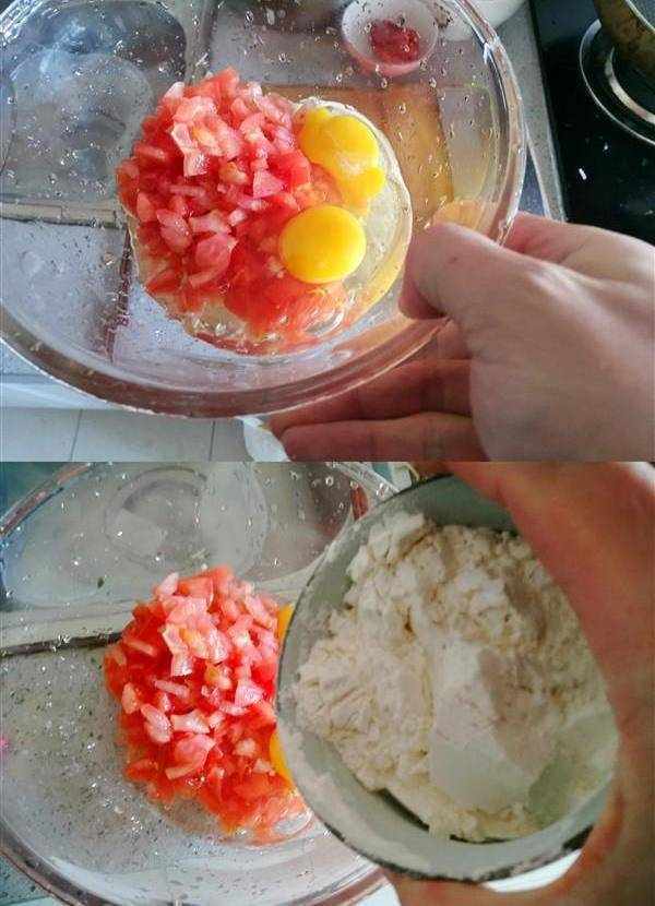 2.将切好的西红柿丁放在大碗中、打入二个鸡蛋
