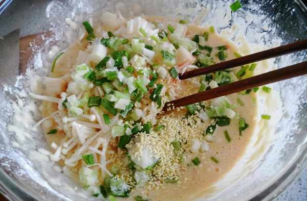 4.加入切好的金针菇、葱花、盐、鸡精、白糖再次进行搅拌均匀。