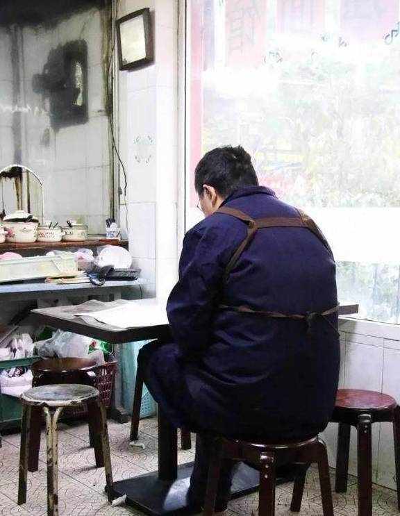没人的时候,老爷叔就这样坐在一张凳子上看报纸,也不玩手机,有时会和客人聊聊天,或者到门外抽根烟,做什么事都是不紧不慢的样子。