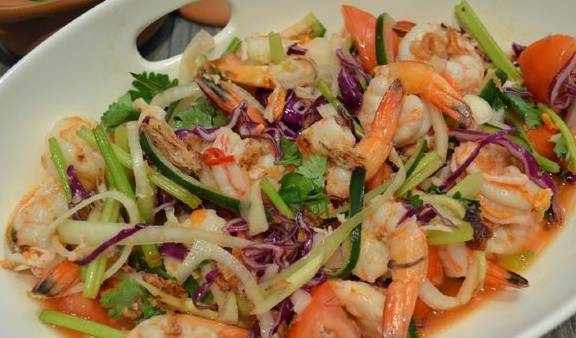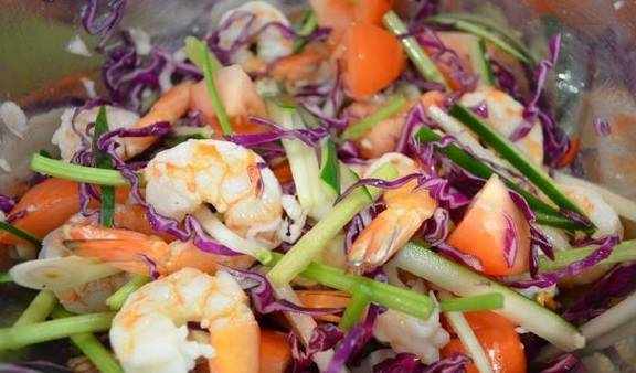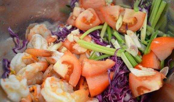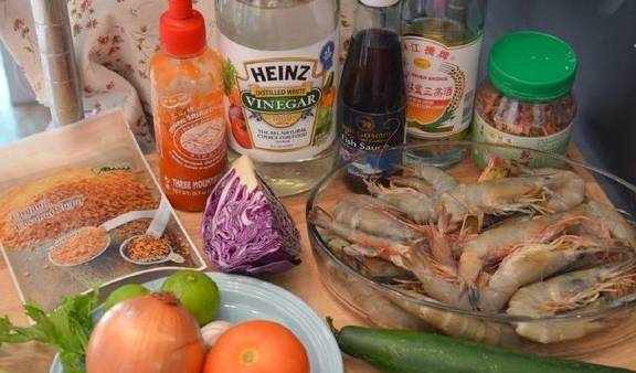 鲜虾1斤、洋葱半个、番茄1个、芹菜1根、黄瓜(青瓜)半条、紫椰菜1/4个、红辣椒2条、蒜2瓣、香茅2枝、香菜(芫茜)1棵、油葱酥少许