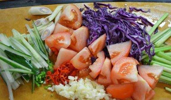 Step5.洋葱、黄瓜、紫椰菜切丝;番茄切小块;芹菜去叶切段。红辣椒去籽切碎;蒜切碎;香茅用刀背拍过后切段。
