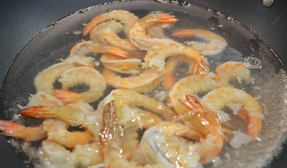 Step3.然后放进滚水中加点米酒烫熟。(不要烫过久,否则虾会很老,约1分钟就可以。)
